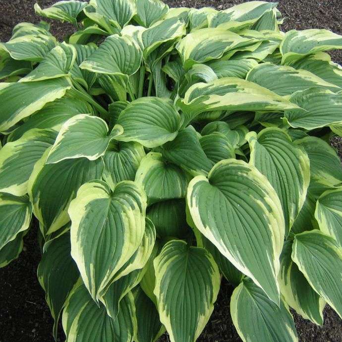 Award-winning shade plant with huge blue-green leaves and creamy white edges. Elegant foundation plant for shaded gardens.