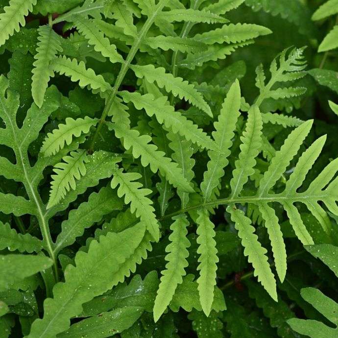 A lush bright-green fern ideal for shady, moist environments such as rain gardens. Adds a woodland aesthetic to shaded beds.